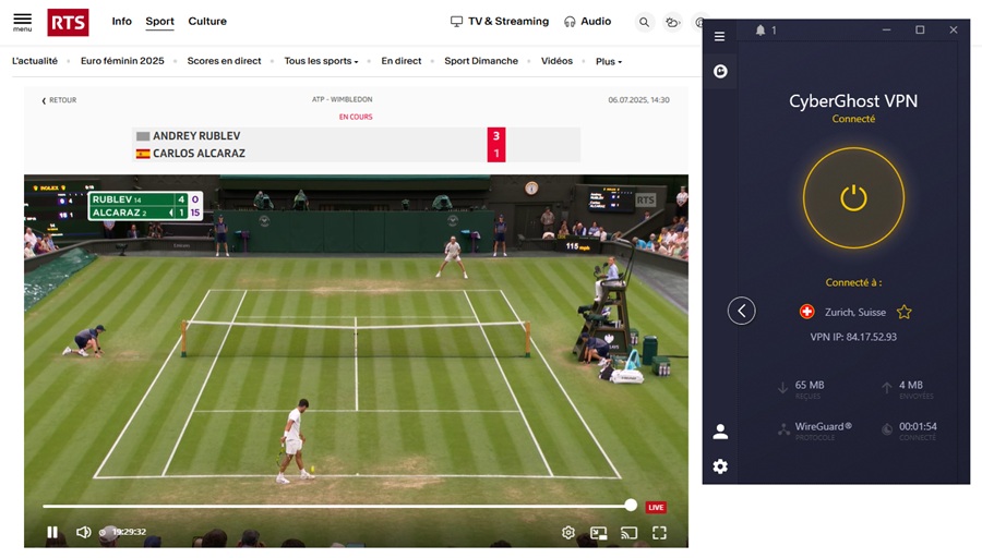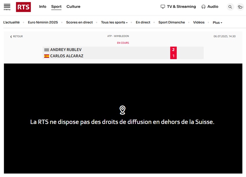 Une fois ces étapes réalisées, vous disposerez d'une adresse IP suisse et serez perçu comme un utilisateur suisse. On constate que l'on a désormais accès au tennis sur RTS :
