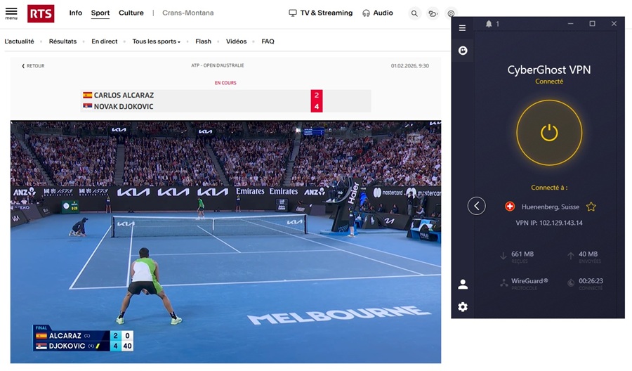 On constate que l'on a bien accès à la finale d'Open d'Australie (Alcaraz-Djokovic) disponible en direct sur RTS grâce à Cyberghost.
